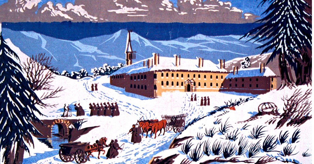 Affiche publicitaire de 1862 montrant les moines trappistes dans les montagnes qui entourent l'abbaye Notre-Dame des Neiges