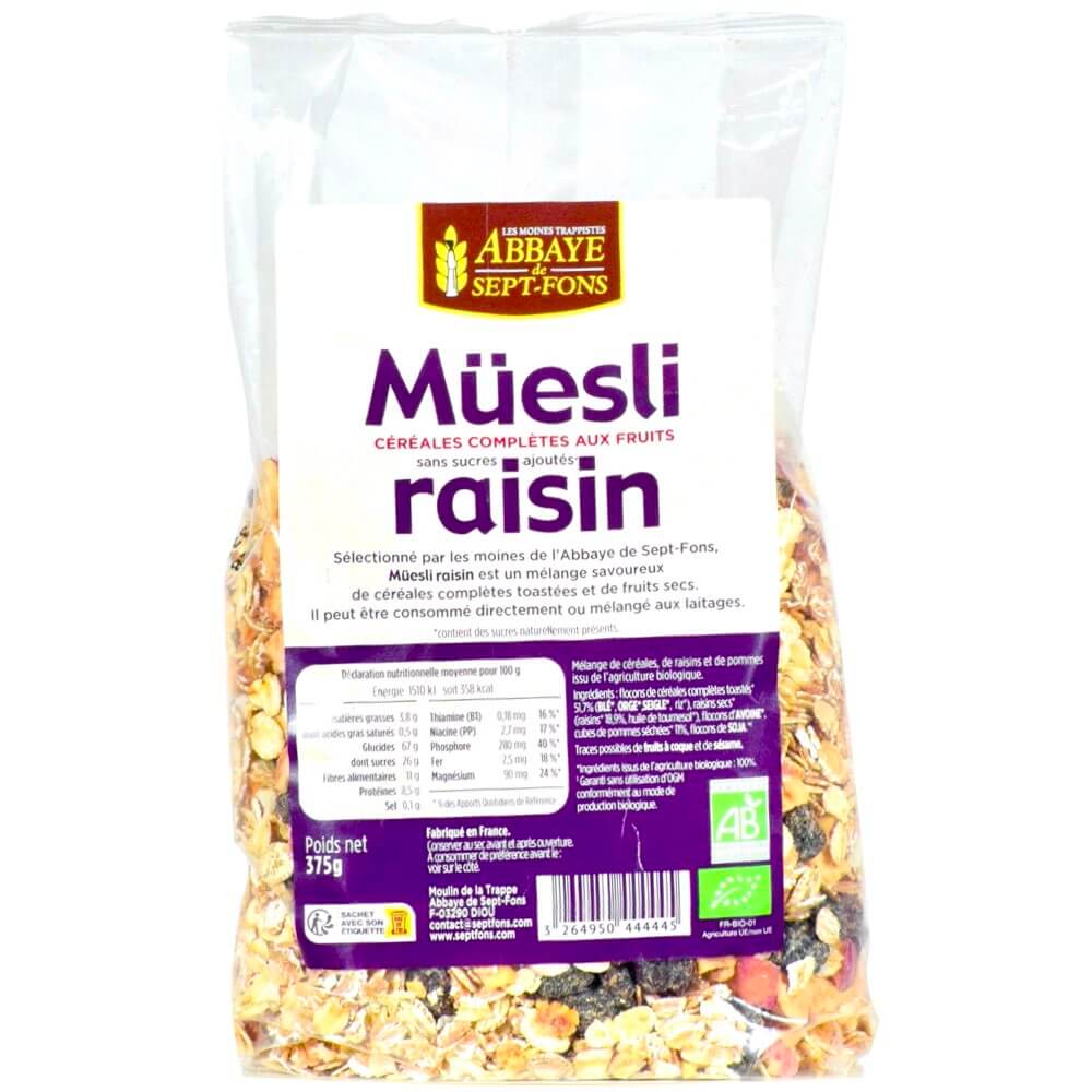 La communauté des moines de l’abbaye Notre-Dame de Sept-Fons est la plus importante de France. Ils sont en effet 80 moines à vivre sur place ! Les frères produisent toutes sortes de produits nutritionnels et diététiques, dont ce muesli BIO complet aux raisins et aux pommes. Tout d’abord, ils en sélectionnent soigneusement chaque ingrédient. Ils veillent ainsi à ce que les céréales soient bien des céréales complètes. Celles-ci ont en effet gardé leur enveloppe extérieure, très riche en fibres, et leur germe. Elles sont ainsi plus riches en nutriments que les céréales classiques ! Puis, ils ajoutent aussi de délicieux petits morceaux de raisin secs bio, ainsi que de petits copeaux de pommes (bio elles aussi). Car oui, les moines ne font rien à moitié. Tout, y compris les céréales, est issu de l’agriculture biologique et garanti sans OGM ! Ce petit concentré de vitamines B1, B3, de phosphore, de fer et de magnésium est ainsi une véritable source d’énergie pour le matin. Le muesli BIO complet aux raisins et aux pommes se prend dans un yaourt au dessert, ou bien dans un bol de lait froid au petit-déjeuner tiens ! Dans tous les cas, votre voeu céréalisé 😇